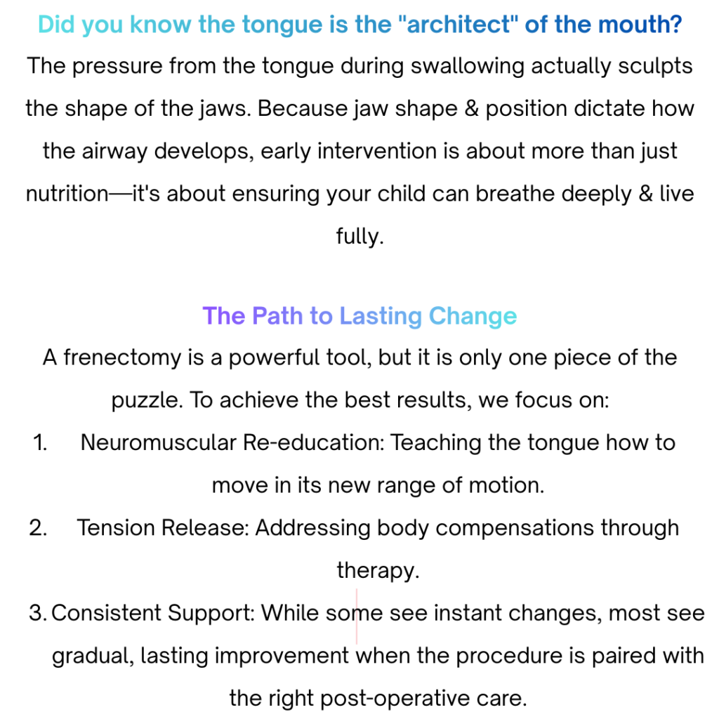 Oral frena are the fibrous attachments of the lips and tongue to the jaws. While everyone has them, their shape and flexibility are influenced by genetics and development. When these tissues are restrictive (commonly known as tongue or lip ties), they can create a ripple effect that impacts: